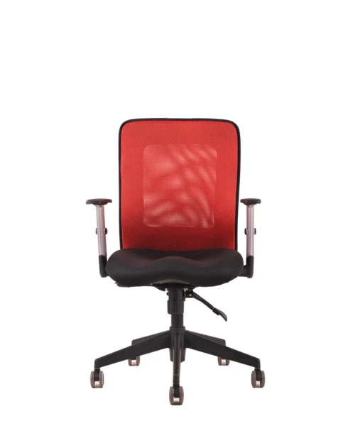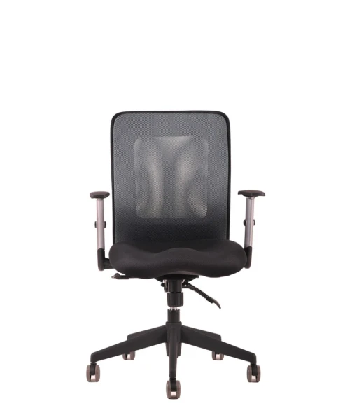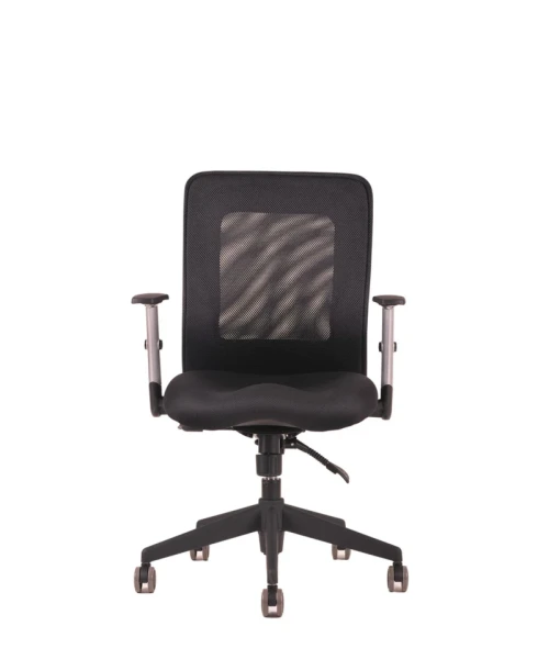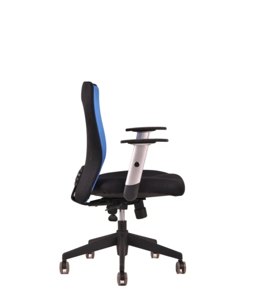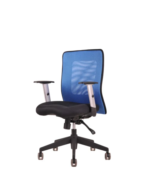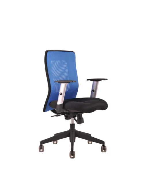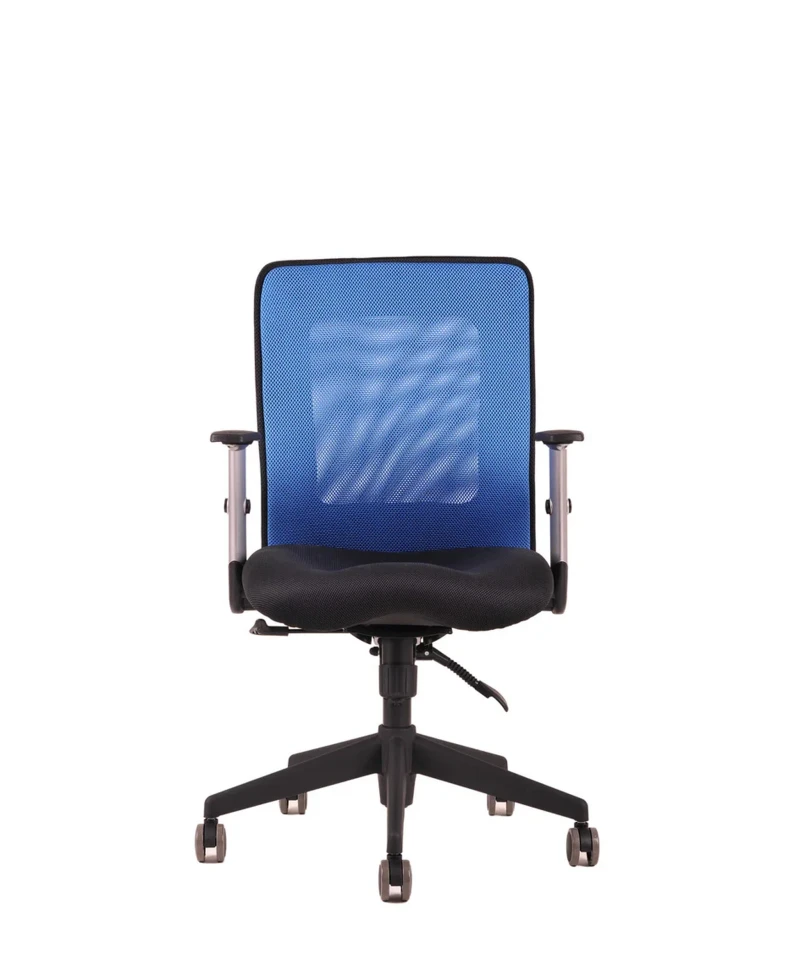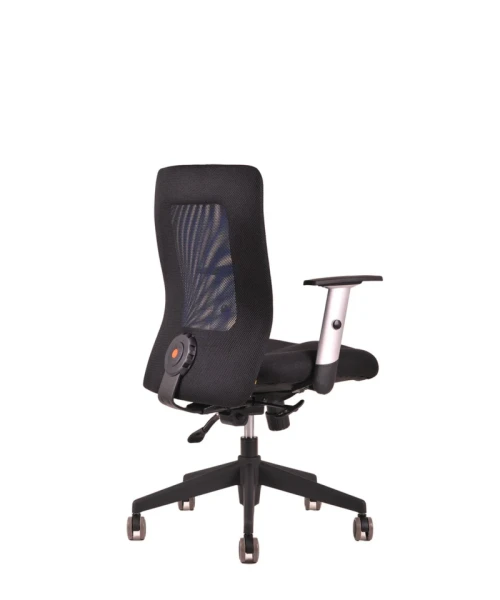 Otočná kancelárska stolička so sieťovaným operadlom. Synchrónny mechanizmus umožňuje zafixovať sklon operadla v ktorejkoľvek polohe a nastavenie sily protiváhy podľa telesnej hmotnosti.