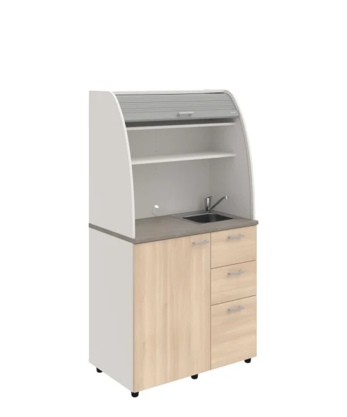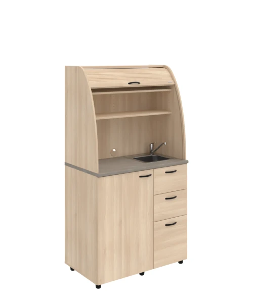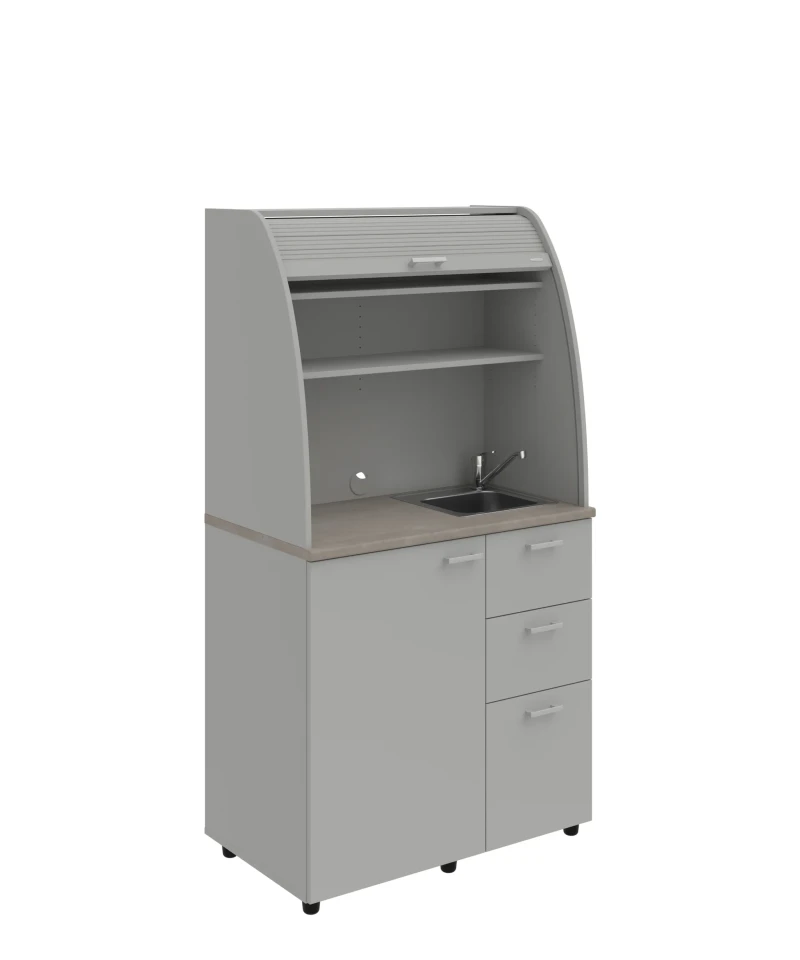 Elegantné riešenie pre rokovacie miestnosti, alebo kancelárie. Aj pri relatívne malých rozmeroch (šírka 100 cm, hĺbka 60 cm, výška 189 cm) dokáže kuchynka ukrývať veľa vybavenia. Okrem plastového príborníka je možné dodať modul s drezom a batériou, alebo dokonca aj so vstavanou minichladničkou (Gorenje, 99l+15l). V závislosti od umiestnenia je možné zvoliť pravý, alebo ľavý variant.