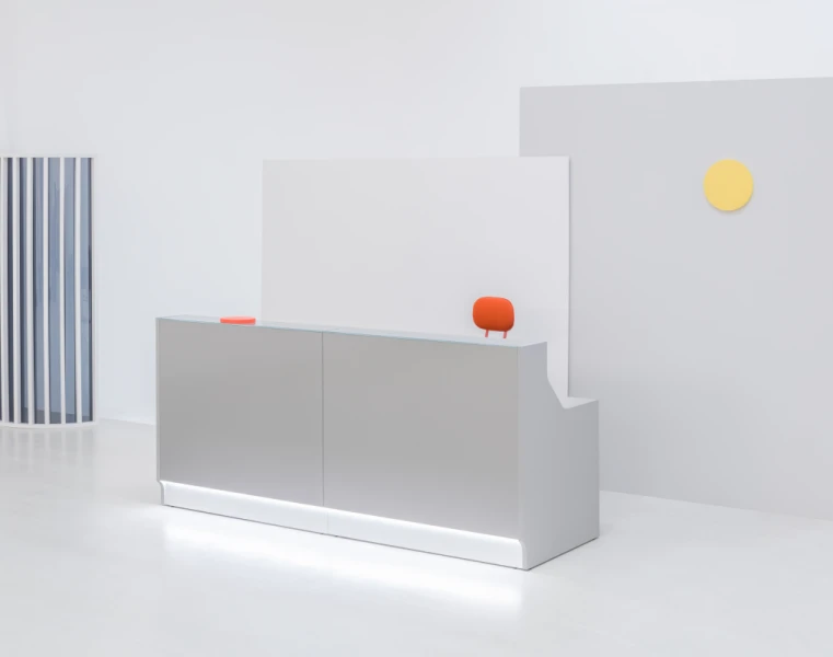 Modulárny recepčný stôl Linea dokazuje, že menej znamená viac. Jednoduchý tvar zdobia hliníkové dizajnové prvky, zatiaľ čo podsvietenie spodnej časti zdôrazňuje sklenenú prednú časť.