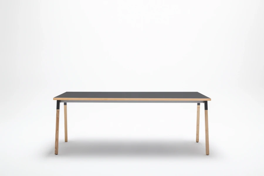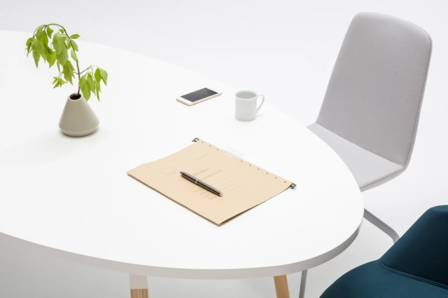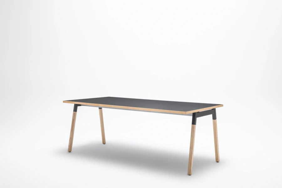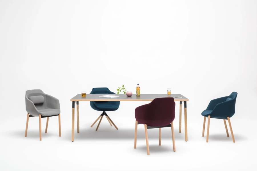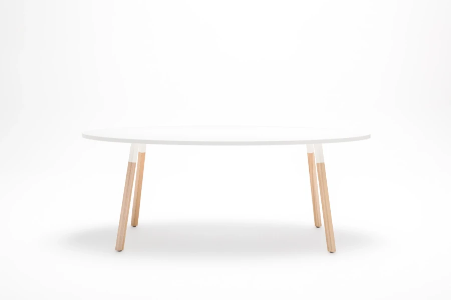 Perfektne sa hodí do všetkých konferenčných miestností a kancelárií. Široká škála tlmených farieb mu dodáva minimalistický charakter. Pracovná doska je k dispozícii v dvoch tvaroch: oválnej a obdĺžnikovej. Výrazné drevené nohy, ktoré sú k pracovnej doske pripevnené kovovým rámom, sú vyrobené z odolného jaseňového dreva. Tento nábytok je určený používateľom, ktorí sa zameriavajú na odolnosť výrobku v kombinácii s funkčnosťou a štýlom.