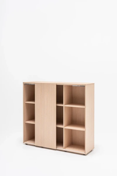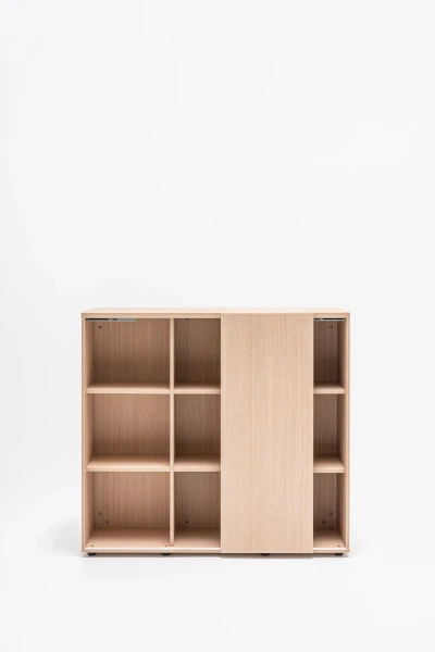 Nadčasový dizajn skrine Quando dodáva priestoru okolo nej modernú eleganciu a profesionálnejší dojem. Posuvné dvere spolu s hliníkovými úchytkami a detailmi dávajú vyniknúť minimalistickej forme v interiéri. Táto nízka skrinka, navrhnutá ako doplnok k pracovnému stolu, je ideálna na uloženie najpotrebnejších predmetov.