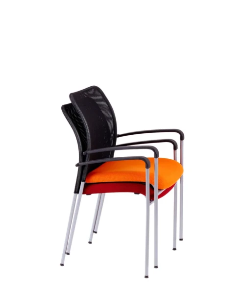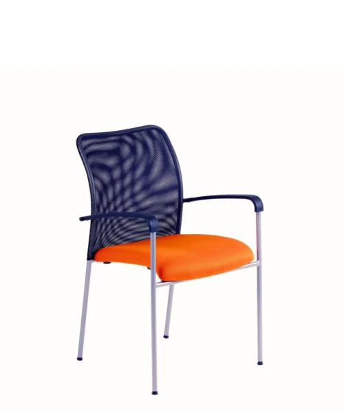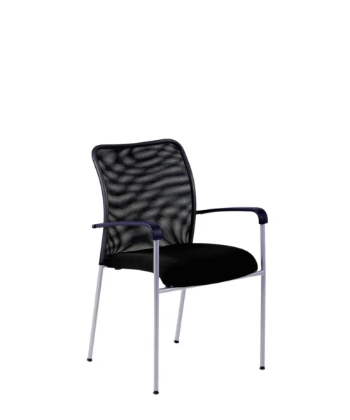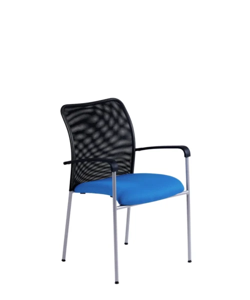 Jednoduchá a funkčná stolička s pevnou kovovou konštrukciou a sieťovaným operadlom.