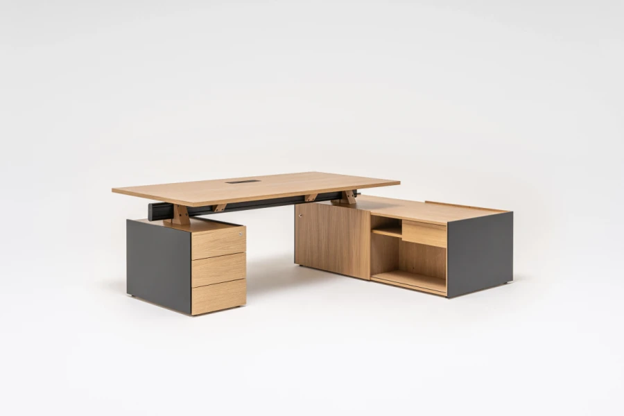 Manažérsky stôl Viga sa dodáva v niekoľkých veľkostiach s voliteľnou bočnou manažérskou skrinkou, ktorá pomôže udržať poriadok v dokumentoch a kancelárskych predmetoch. Vždy vychádza zo svojho ikonického extrudovaného hliníkového nosníka, ktorý sa prezentuje ako ľahký a zároveň robustný.