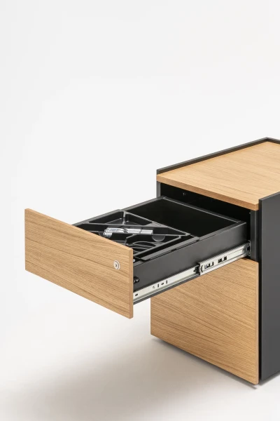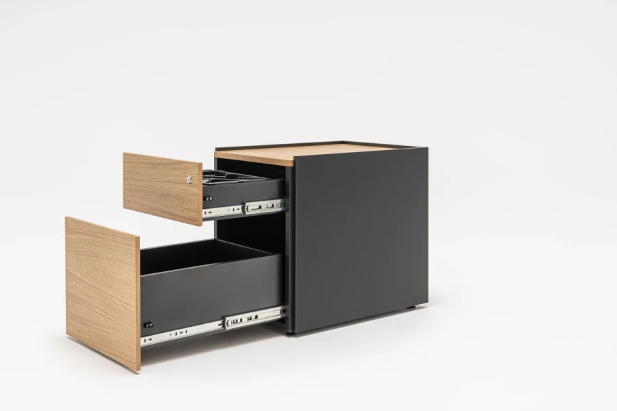 Kontajnery vyrobené z extrudovaného hliníka a dreva, ktoré ponúkajú výnimočnú kombináciu remeselného spracovania a modernosti, sa dodávajú v niekoľkých tvaroch a veľkostiach: so samostatnými zásuvkami, so zásuvkami a peračníkom alebo s otvorenými čelami pre lepší prístup.
