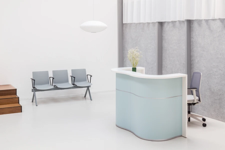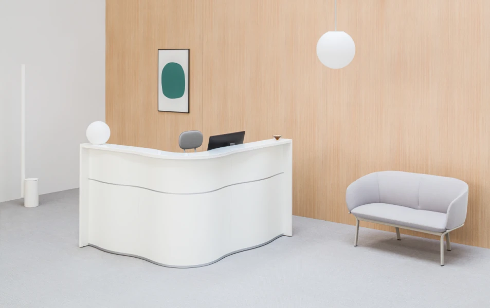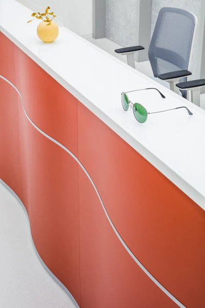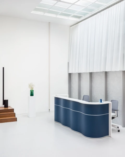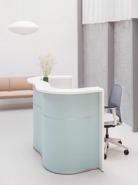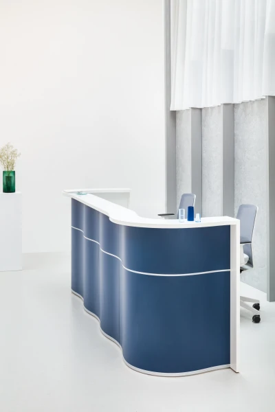 Vlnitá línia odrážajúca silu a pokoj spiaceho oceánu - recepčný stôl Wave vyniká dizajnom. Súčasne luxusný a profesionálny charakter tohto nábytku podčiarkuje lesklá čelná časť a ozdobná hliníková lišta.